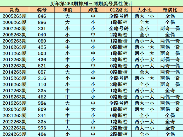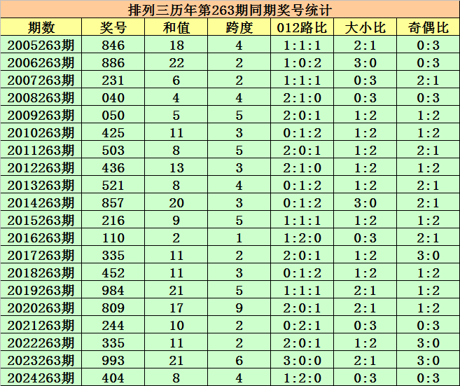 历史上第2025263期陈列三已开出20期奖号了,积年同时奖号别离为:846、886、231、040、050、425、503、436、521、857、216、110、335、452、984、809、244、335、993、404,详备统计见下表: